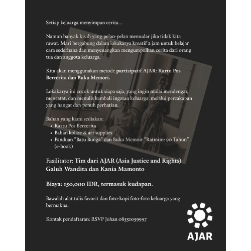 Lokakarya ini cocok untuk siapa saja, yang ingin mulai mendengar, mencatat, dan menulis kembali ingatan keluarga, melalui percakapan yang hangat dan penuh perhatian.